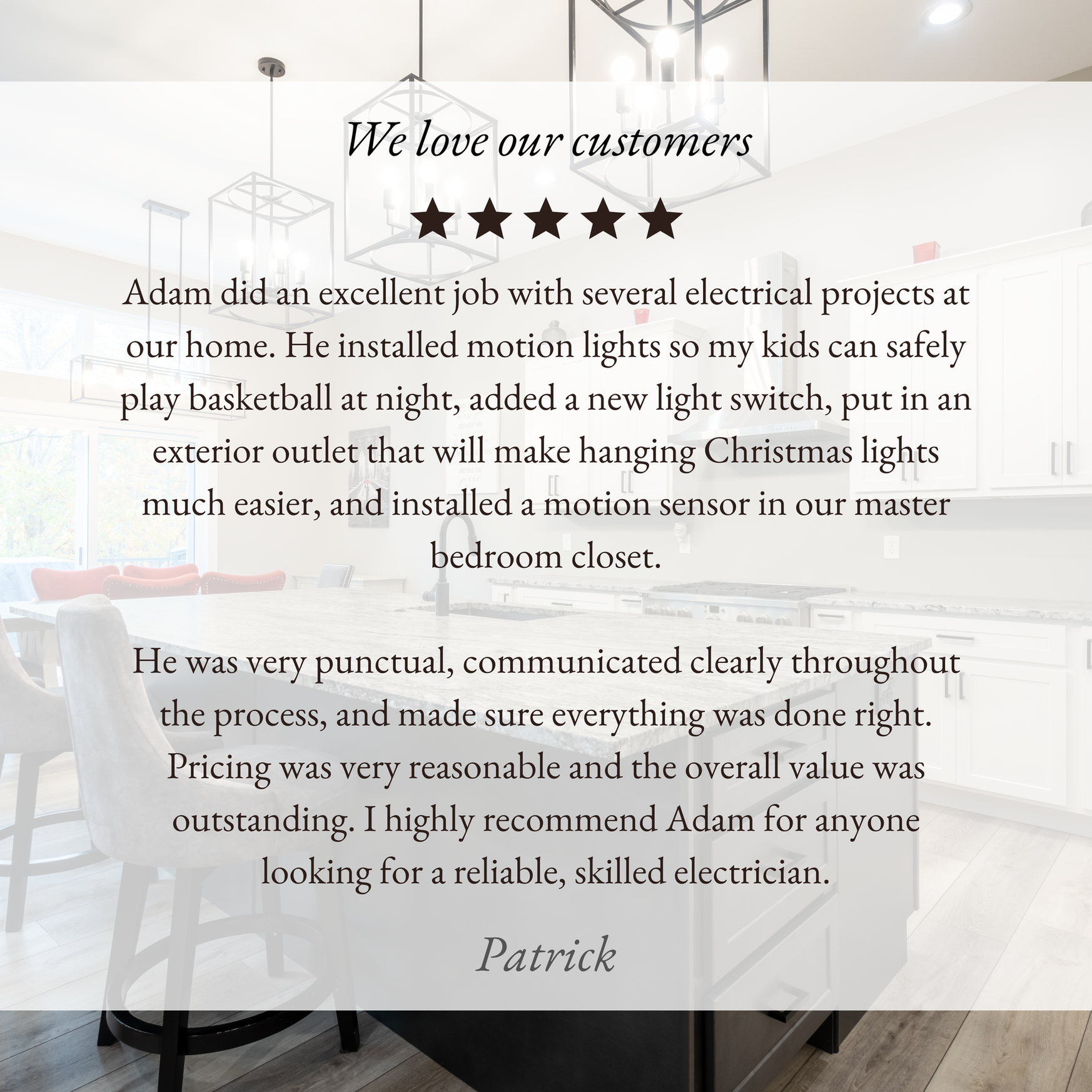 From fixing flickering lights to full electrical remodels, we offer high-quality, affordable residential electrical services you can trust. Our licensed Master Electrician specializes in home panel upgrades, EV charger installations, lighting design, ceiling fan wiring, outlet & switch repairs, and more. We’re known for clean work, fair pricing, and showing up when we say we will—because your home deserves professional care.